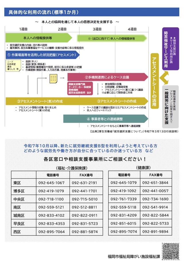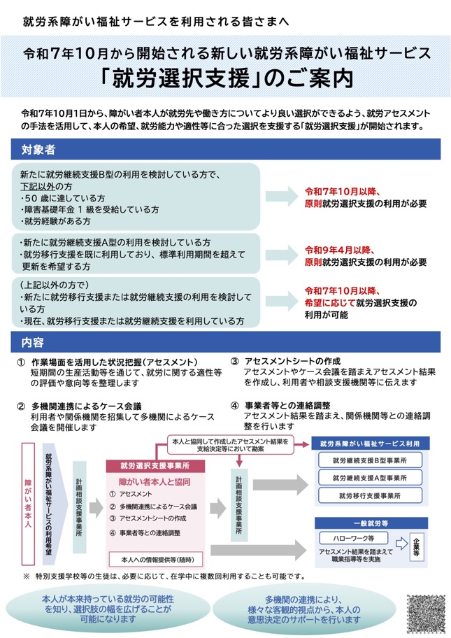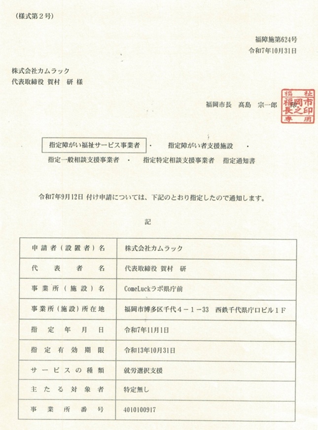 株式会社カムラックでは、令和7年11月1日より新たに「就労選択支援」事業を開所いたします。「就労選択支援」とは、障がい者本人が就労先・働き方についてより良い選択ができるよう、就労アセスメントの手法を活用して、 本人の希望、就労能力や適性等に合った選択を支援するサービスです(令和7年10月1日施行)。