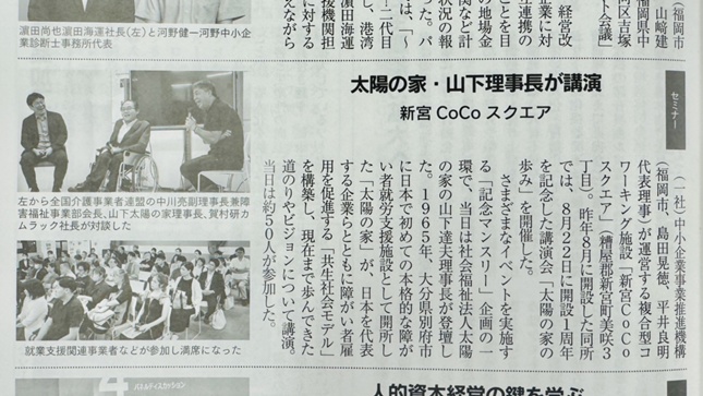 ふくおか経済10月号にて新宮CoCoスクエアで開催されました周年記念イベント、太陽の家山下理事長と全国介護事業者連盟障害福祉事業部会中川会長とカムラック私との鼎談模様が掲載されました。