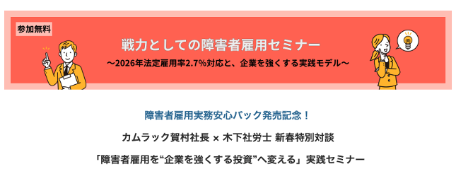 2026年1月23日にPSR主催「戦力としての障害者雇用セミナー ~2026年法定雇用率2.7%対応と、企業を強くする実践モデル~」にカムラックグループ代表の賀村研が登壇いたします。
