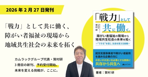 カムラックグループ代表・賀村研、待望の3冊目となる新刊。『「戦力」として共に働く、障がい者福祉の現場から地域共生社会の未来を拓く ー“できる”を信じ、社会を変える挑戦―」』が、ついに予約販売を開始しました!この一冊は、障がい者雇用と福祉の現場で培われた“実践知”...