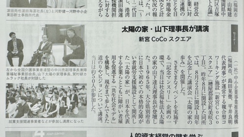 ふくおか経済10月号にて新宮CoCoスクエアで開催されました周年記念イベント、太陽の家山下理事長と全国介護事業者連盟障害福祉事業部会中川会長とカムラック私との鼎談模様が掲載されました。会場満員ありがとうございます。※ふくおか経済様投稿許可済み